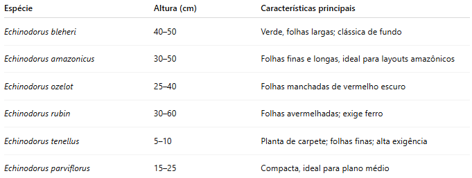 O gênero Echinodorus pertence à família Alismataceae e é nativo principalmente da América do Sul e Central. São plantas palustres (crescem em áreas alagadas) que podem viver tanto submersas quanto emersas, o que as torna extremamente adaptáveis a aquários.